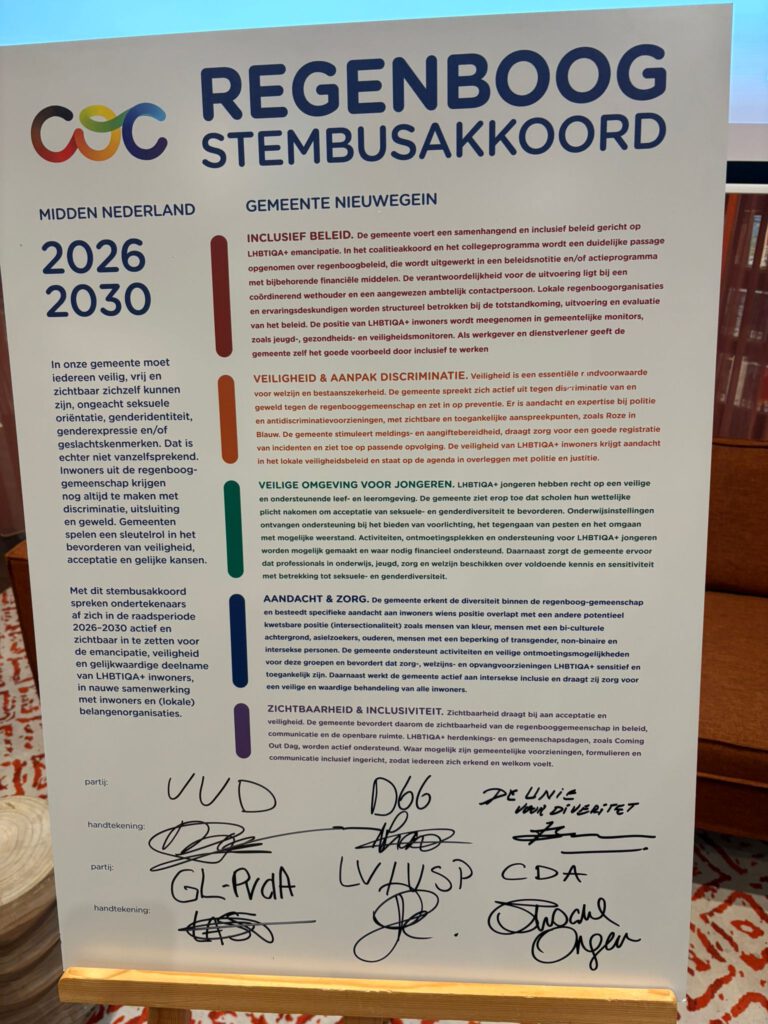 De ondertekening van het akkoord heeft woensdag 4 maart plaatsgevonden in de Bibliotheek in Nieuwegein. Door het COC en de Bibliotheek werd er een waar feestelijk momoment van gemaakt, waarbij ook inwoners aanwezig waren en waarbij de LHBTIQA+-boekenkast in de bieb werd geopend door het college van B&W.