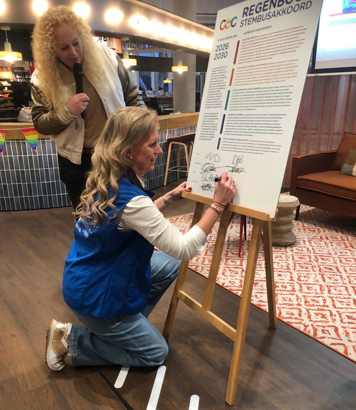 Vandaag heeft lijsttrekker Heleen Peters, namens Lokale Vernieuwing/VSP, het Regenboog Stembus Akkoord 2026-2030 ondertekend. Door dit akkoord te ondertekenen spreekt Lokale Vernieuwing/VSP uit zich in de raadsperiode 2026-2030 actief en zichtbaar in te zetten voor de emancipatie, veiligheid en gelijkwaardige deelname van de LHBTIQA+ inwoners in onze stad.